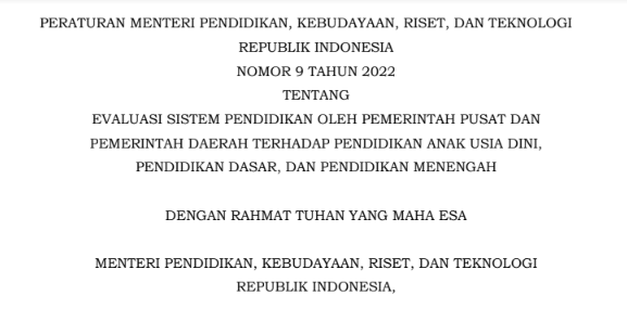 Gurubagi.com. Permendibudristek Nomor 9 Tahun 2022 tentang Evaluasi Sistem Pendidikan oleh Pemerintah Pusat dan Pemerintah Daerah terhadap Pendidikan Anak Usia Dini, Pendidikan Dasar, dan Pendidikan Menengah telah diterbitkan Menteri Pendidikan, Kebudayaan, Riset, dan Teknologi (Mendikbudristek).