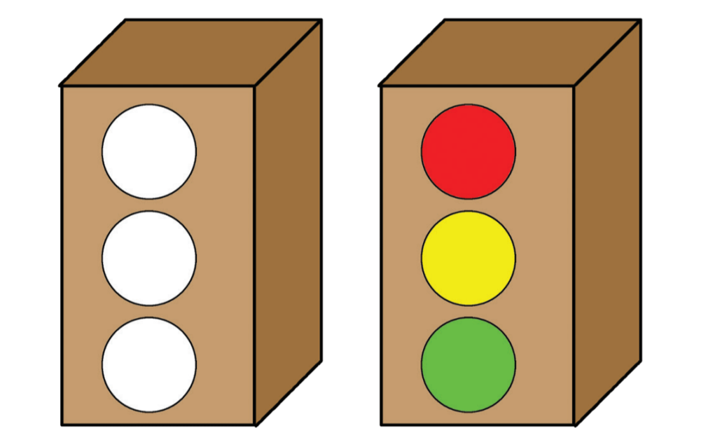 5. Kemudian tempelkan kertas untuk menutupi lubang sesuai urutan lampu lalu lintas yaitu merah, kuning, dan paling bawah hijau. Kertas ditempel pada permukaan dalam kardus sepatu.