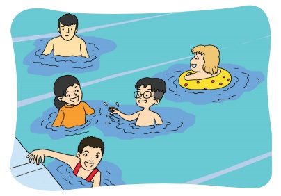 mereka membilas anggota tubuh. Mereka masuk kolam secara perlahan. Udin, Mutiara, dan kakek menaati peraturan di kolam renang. Apakah kamu seperti mereka?