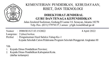 Gurubagi.com. Pengumuman Hasil Seleksi Tahap Ke-1 Kepala Sekolah Calon Pelaksana Program Sekolah Penggerak (PSP) Angkatan III telah diterbitkan oleh Direktorat Jenderal Pendidikan dan Kebudayaan, Kemendikbudristek.