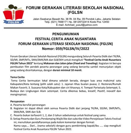 Di dalam oengumuman tersebut disampaikan bahwa Forum Gerakan Literasi Sekolah Nasional (FGLSN) mengundang Seluruh Peserta Didik dari TK/R, SD/MI, SMP/MTs, SMA/SMK/MA dan SLB/SKH untuk mengikuti “Festival Cerita Anak Nusantara FGLSN Tahun 2022” tentang Makanan dan Jalan–jalan (Food and Traveling).