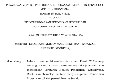 Di dalam rangka melaksanakan ketentuan Pasal 27 Undang-Undang Nomor 14 Tahun 2019 tentang Pekerja Sosial, maka diterbitkan Peraturan Menteri Pendidikan, Kebudayaan, Riset, dan Teknologi tentang Penyelenggaraan Pendidikan Profesi dan Uji Kompetensi Pekerja Sosial.