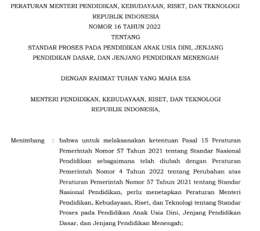 Permendikbud Nomor 16 Tahun 2022 ini diterbitkan untuk melaksanakan ketentuan Pasal 15 Peraturan Pemerintah Nomor 57 Tahun 2021 tentang Standar Nasional Pendidikan sebagaimana telah diubah dengan Peraturan Pemerintah Nomor 4 Tahun 2022 tentang Perubahan atas Peraturan Pemerintah Nomor 57 Tahun 2021 tentang Standar Nasional Pendidikan, perlu menetapkan Permendikbudristek tentang Standar Proses pada Pendidikan Anak Usia Dini, Jenjang Pendidikan Dasar, dan Jenjang Pendidikan Menengah.