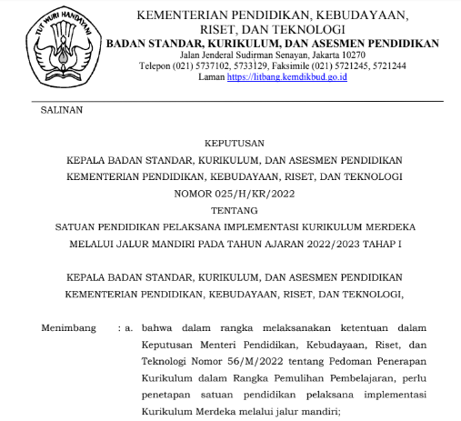Berdasarkan pertimbangan tersebut, maka ditetapkan Keputusan Kepala Badan Standar, Kurikulum, dan Asesmen Kementerian Pendidikan, Kebudayaan, Riset, dan Teknologi tentang Satuan Pendidikan Pelaksana Implementasi Kurikulum Merdeka Melalui Jalur Mandiri pada Tahun Ajaran 2022/2023 Tahap 1.