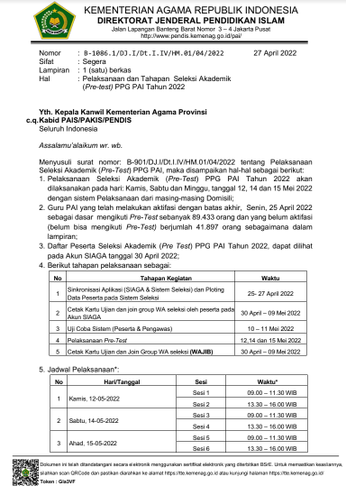 Surat Edaran diterbitkan untuk menyusuli surat nomor: B-901/DJ.I/Dt.I.IV/HM.01/04/2022 tentang Pelaksanaan Seleksi Akademik (Pre-Test) PPG PAI 2022.