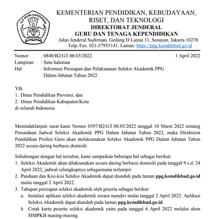 Informasi tentang Persiapan dan Pelaksanaan Seleksi Akademik PPG Dalam Jabatan 2022 tersebut tertuang dalam Surat Edaran Dirjen GTK Nomor 0840/B2/GT.00.03/2022 tertanggal 1 April 2022.