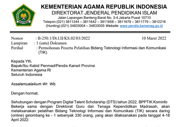 Permohonan Peserta Pelatihan Bidang Teknologi Informasi dan Komunikasi (TIK) tersebut tertuang dalam Surat Edaran Dirjen Pendidikan islam Nomor B-250.1/Dt.I.II/KS.02/03/2022 tertanggal 10 Maret 2022.