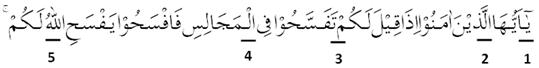 1 : Mad jaiz munfashil, bacaan ya dibaca panjang 4-6 harakat. Asalnya bunyi ya dibaca 2 harakat (mad thabi’i) namun karena berhadapan dengan hamzah di lafadz lain maka dibaca panjang menjadi 4-6 harakat (mad jaiz munfashil).
