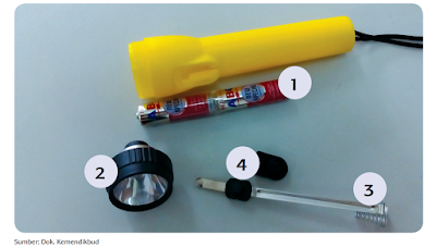 Tuliskan proses perjalanan arus listrik pada rangkaian listrik senter tersebut secara rinci dan berurutan!
