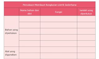 Pada halaman 6, teman-teman diminta mencoba membuat rangkaian listrik seperti pada senter. Di bab ini teman-teman hanya diminta menyebutkan alat dan bahan yang dibutuhkan untuk melakukan percobaan tersebut. Alat dan bahan ditulis dalam bentuk tabel seperti pada gambar.