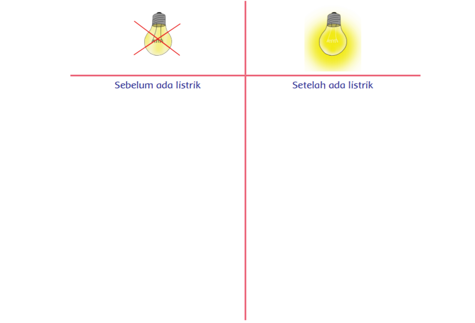 Pada halaman 7, teman-teman diminta mengisi tabel tentang perbedaan-perbedaan antara masa sebelum ada listrik dan sesudah ada listrik.
