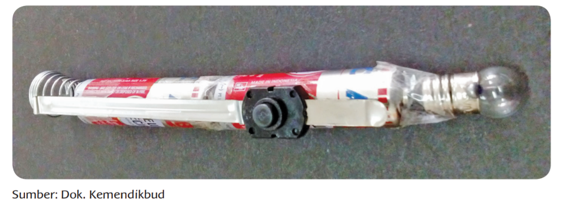 Tuliskan proses perjalanan arus listrik pada rangkaian listrik senter tersebut secara rinci dan berurutan!