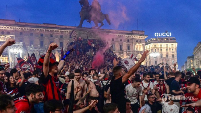 Fans AC Milan merayakan di pusat kota Milan setelah AC Milan memenangkan kejuaraan sepak bola “Scudetto” Serie A Italia 2022, pada 22 Mei 2022. (Photo by MIGUEL MEDINA / AFP) (AFP/MIGUEL MEDINA)Fans AC Milan merayakan di Galleria Vittorio Emanuele II di pusat kota Milan setelah AC Milan memenangkan kejuaraan “Scudetto” Serie A Italia 2022, pada 22 Mei 2022. (Photo by MIGUEL MEDINA / AFP) (AFP/MIGUEL MEDINA)Pemain depan AC Milan Swedia Zlatan Ibrahimovic, memegang cerutu, merayakan selama upacara trofi pemenang setelah AC Milan memenangkan pertandingan sepak bola Serie A Italia antara Sassuolo dan AC Milan, mengamankan kejuaraan “Scudetto” pada 22 Mei 2022 di Mapei – Citta del Stadion tiga warna di Sassuolo. (Photo by Tiziana FABI / AFP) (AFP/TIZIANA FABI)Bek AC Milan Italia Alessio Romagnoli (tengah) dan para pemain AC Milan merayakan dengan trofi pemenang setelah AC Milan memenangkan pertandingan sepak bola Serie A Italia antara Sassuolo dan AC Milan, mengamankan gelar “Scudetto” pada 22 Mei 2022 di Mapei – Citta Stadion del Tricolore di Sassuolo. (Photo by Tiziana FABI / AFP) (AFP/TIZIANA FABI)