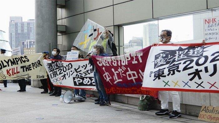 TRIBUNNEWS.COM, TOKYO – Sekitar 20 orang yang memprotes agar penayangan film rekaman resmi “Olimpiade Tokyo 2020 SIDE: A” dari Olimpiade Tokyo dibatalkan, terjadi di depan bioskop di Roppongi, Tokyo pada sore hari Senin (23/5/2022).